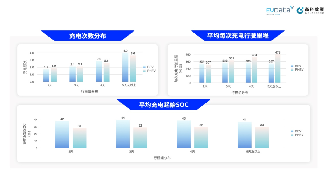 尽管BEV和PHEV的充电次数接近,但平均每次充电的行驶距离却有差异化表现。在不同组别中,BEV每次充电的行驶距离有较为稳定的表现,每次充电间约有330公里行程,PHEV则呈现了差异化,2天组充电间隔里程较短(约307公里),而5天及以上组则达到了(478公里)。